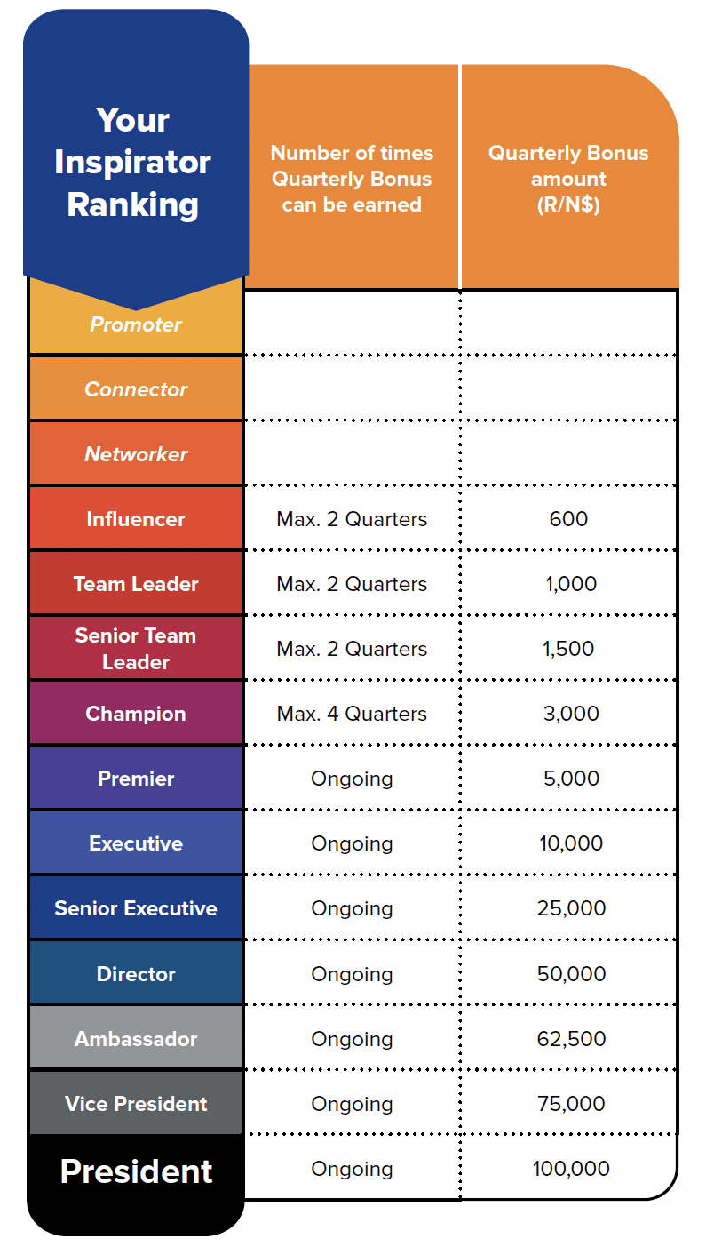 To qualify for quarterly bonuses, Inspirators must meet certain criteria each month during the quarter. The quarterly bonus amounts vary and are based on the lowest Inspirator Ranking achieved in any particular quarter, with higher ranking earning larger bonuses. For example, a Champion can earn R/N$3,000 up to 4 times while a President can earn R/N$100,000 every quarter that the ranking is maintained!